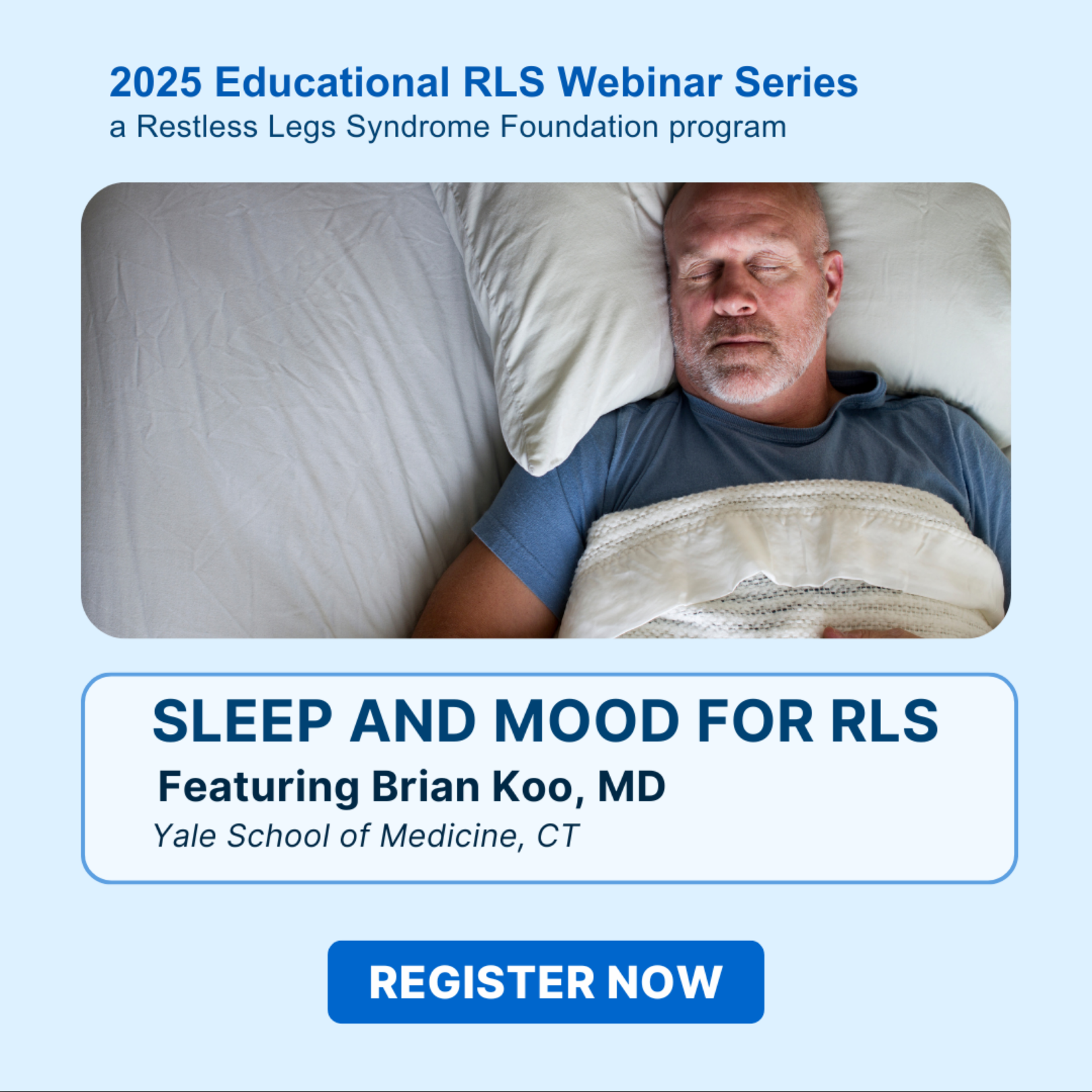 Date: Thursday, October 30, 2025Time: 10am PT / 11am MT / 12pm CT / 1pm ETSpeaker: Dr. Brian KooTopic: Sleep and Mood with RLS